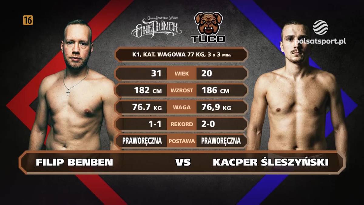 Kacper Śleszyński - Filip Benben. Skrót walki23.01.2026Sporty walkiTwoja przeglądarka nie wspiera odtwarzacza wideo...Zobacz takżeOne Punch 5: Pelak - Sabaciński. Wyniki walkFacebookXWykopKacper Śleszyński pokonał Filipa Benbena jednogłośną decyzję sędziów (3-0) na gali One Punch 5.ONE PUNCH 5PolsatSport.pl w wersji na telefony z systemem Android i iOS!Najnowsze informacje i wiadomości na bieżąco, gdziekolwiek jesteś.Dostępne w Google PlayPobierz z App Store