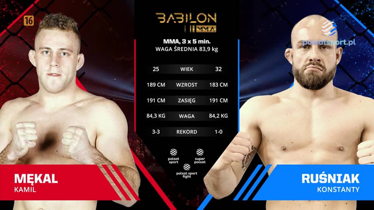 MMA/ 84 kg/ 3 x 5 min - Kamil Mękal (4-3) pokonał Konstantego Ruśniaka (1-1) jednogłośną decyzją sędziów (30-27, 29-28, 30-27) na gali Babilon MMA 55 w Radomiu.
