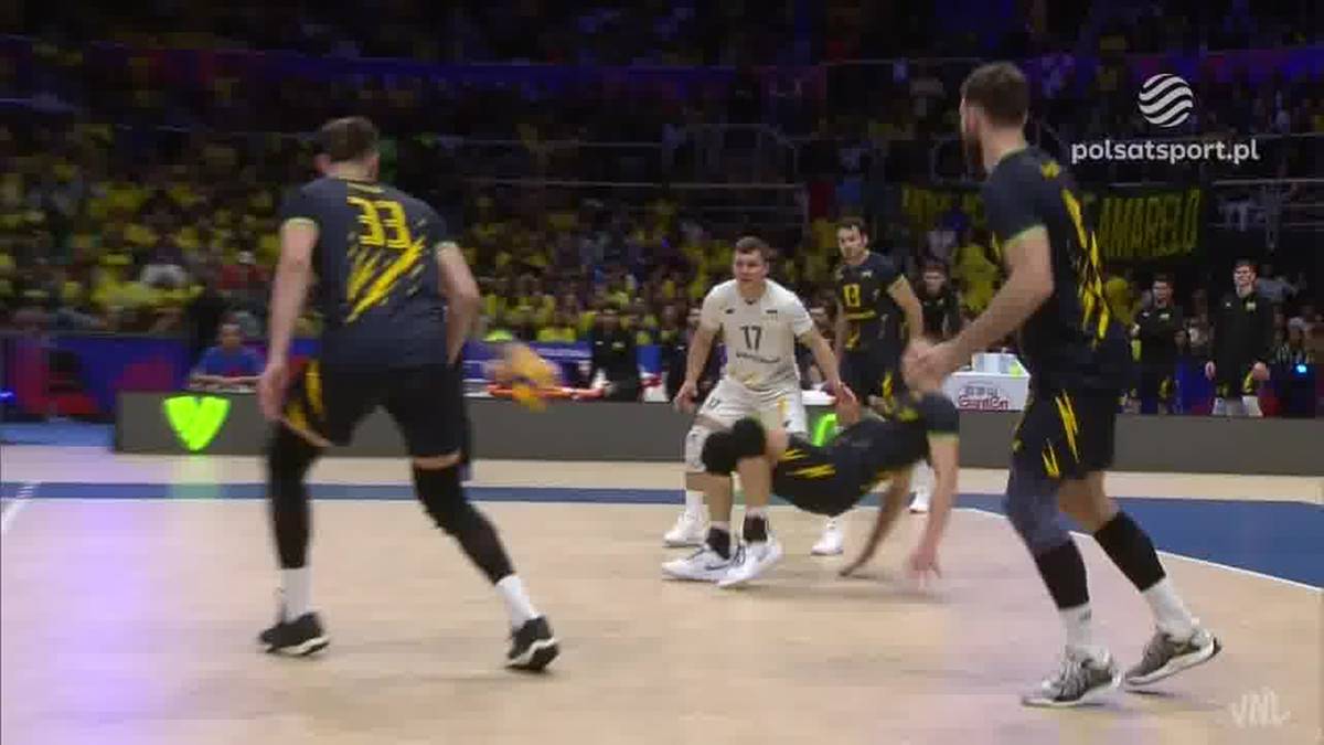Brazylia – Ukraina 3:2 (19:25, 14:25, 25:22, 25:23, 15:10). Liga Narodów 2025 - siatkówka. Illia Kovalov popisał się efektownym zagraniem nogą.
