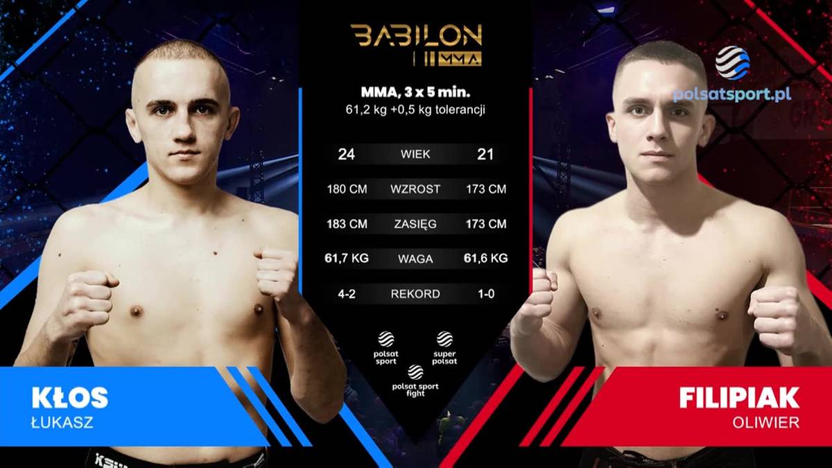 3 x 5 min/61 kg: Oliwier Filipiak (2-0) pokonał Łukasza Kłosa (4-3) przez poddanie (skrętówka) w pierwszej rundzie na gali Babilon MMA 54 w Grudziądzu.