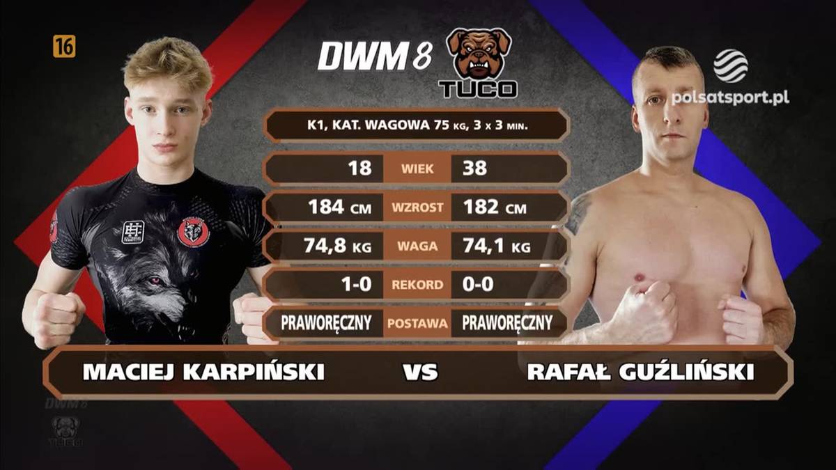 75 kg: Maciej Karpiński (2-0-0) pokonał Rafała Guzlińskiego (0-1-0) przez techniczny nokaut (kolano na wątrobę) w drugiej rundzie na gali DWM 8 w Świdwinie - K1 w małych rękawicach.