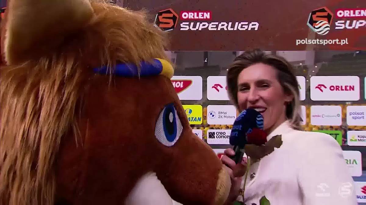 Michał Olejniczak udzielał wywiadu po zakończeniu spotkania Industria Kielce - Rebud KPR Ostrovia. Wypowiedź zawodnika przerwała maskotka kieleckiego klubu, by wręczyć Iwonie Niedźiwedź kwiatka z okazji Dnia Kobiet.