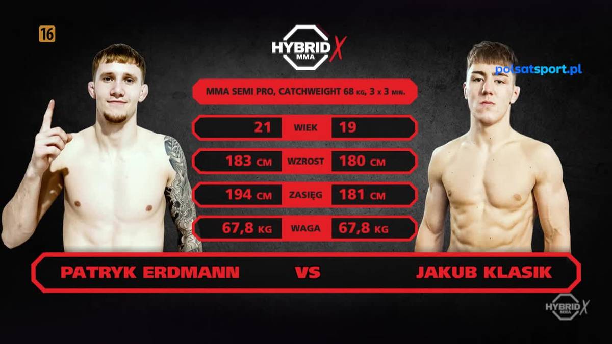 Waga piórkowa (65.8 kg): Jakub Klasik pokonał Patryka Erdmanna niejednogłośną decyzją sędziów na gali Hybrid MMA 10 w Pile.