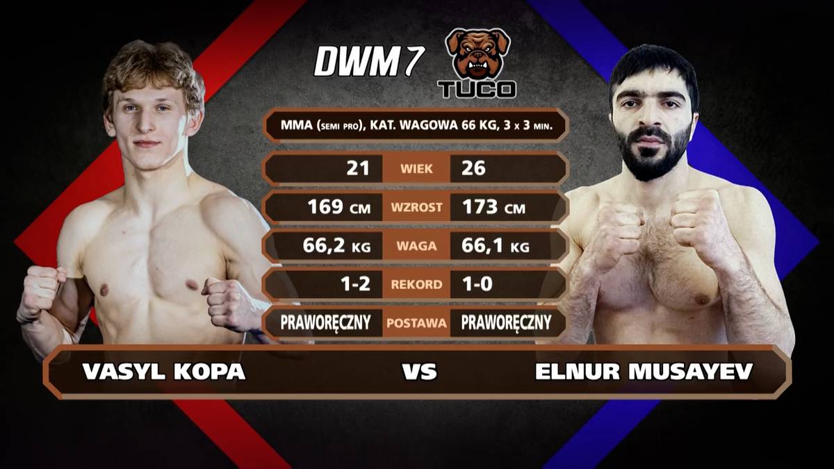 Wasyl Kopa (1-2-0) pokonał Elnura Musajewa (1-1-0) przez poddanie (balacha na kolano) w pierwszej rundzie na gali DWM 7 w Wieluniu (walka na zasadach amatorskiego MMA, waga piórkowa - 66 kg).