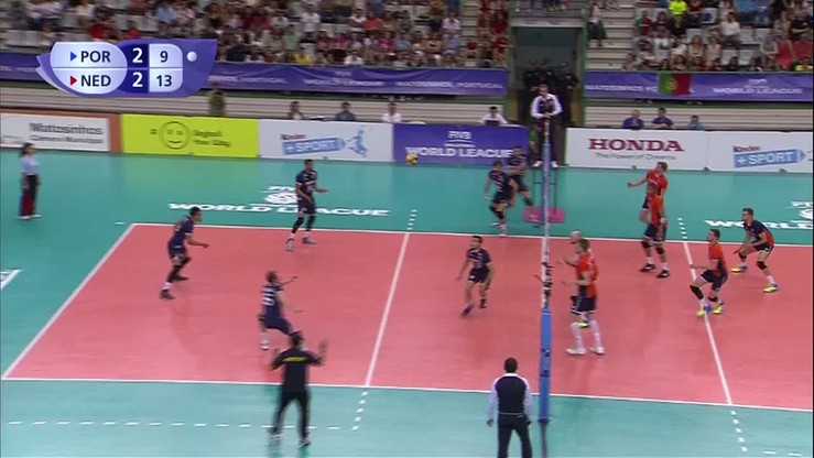 Rywalizacja w grupie E rozpoczęła się od spotkań Portugalia - Holandia rozegranych w miejscowości Matosinhos. Pierwszy mecz tych drużyn zainaugurował tegoroczną edycję Ligi Światowej. Pierwszy punkt, po ataku ze środka zdobył Joao Jose. Pierwsza partia również padła łupem gospodarzy, choć do ostatnich piłek trwała wyrównana walka o zwycięstwo (23:23). Decydujące punkty dla Portugalczyków zdobyli Alexandre Ferreira i Joao Jose - po ataku z przechodzącej piłki. Wygrana w premierowej odsłonie to jednak wszystko, na co było tego dnia stać gospodarzy. Kolejne partie zdecydowanie wygrali rozpędzeni Holendrzy. W czwartej Portugalczycy toczyli wyrównaną walkęz rywalami jedynie do stanu 10:10, ale na drugiej przerwie mieli już cztery punkty straty. Po ataku Dicka Kooya po dłoniach rywali Holendrzy mieli piłkę meczową (19:24). Portugalczycy obronili się w następnej akcji, ale w kolejnej Kay van Dijk skutecznym atakiem zakończył spotkanie.