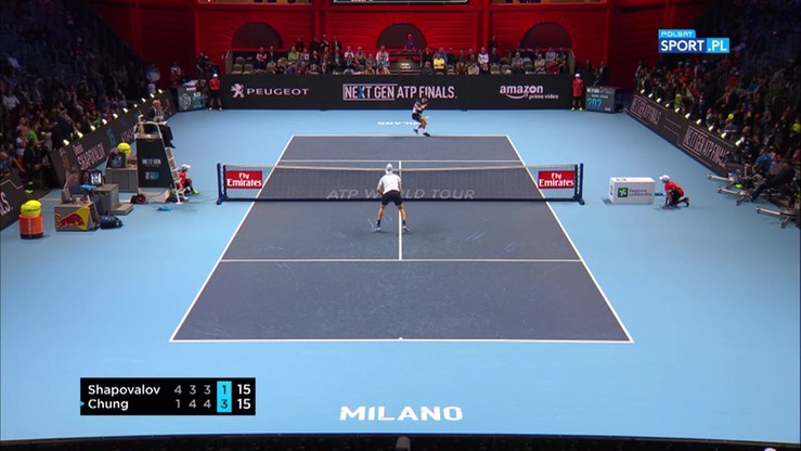 W piątym gemie czwartego seta rywalizacji przy serwisie Hyeona Chunga moment zawahania miał Denis Shapovalov. Piłka po zagraniu Koreańczyka zatańczyła na taśmie i przewinęła się na stronę utalentowanego osiemnastolatka. Kanadyjczyk ruszył do niej i udowadniając, że ma znakomity refleks zdołał ją podbić.