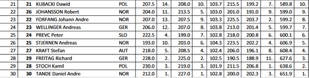 Swoją przewagę nad Wellingerem powiększy zaś Robert Johansson, który wylądował na 213. metrze. Po skokach dwudziestu zawodników Norweg jest liderem z notą 408,0.
