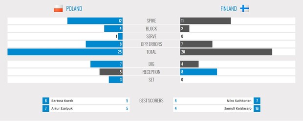 Grupa sympatyków z Finlandii była liczniejsza, ale na parkiecie to Polacy mieli wyraźną przewagę we wszystkich elementach: atak (57–44), blok (11–5), zagrywka (8–1); obie ekipy popełnili sporo błędów własnych (27–28). Najlepiej punktowali: Artur Szalpuk (19), Mateusz Bieniek (14), Bartosz Kurek (13), Michał Kubiak (12) – Polska; Samuli Kaislasalo (14), Niko Suihkonen (10) – Finlandia.