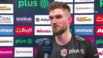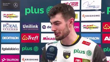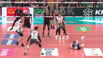 Siatkarz Trefla Gdańsk Kewin Sasak i Yacine Louati z Asseco Resovii Rzeszów podczas pierwszego meczu ćwierćfinałowego PlusLigi.