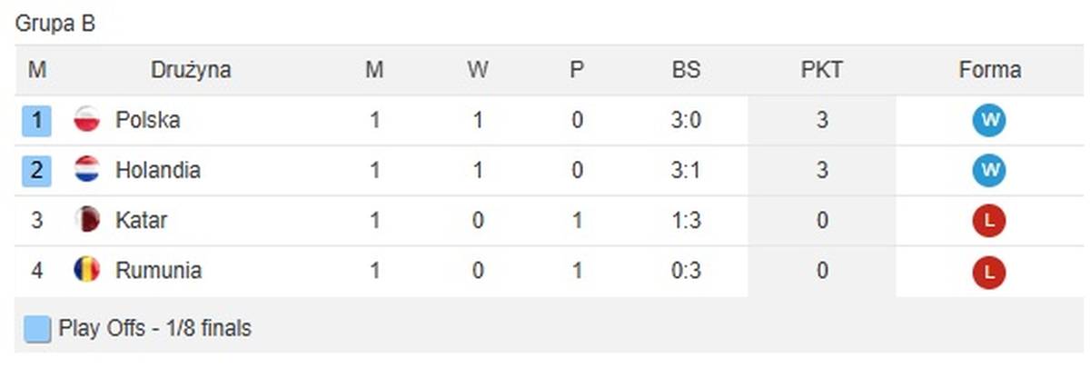 Oprócz Polski i Rumunii, w grupie B rywalizują Katar i Holandia. W starciu Katarczyków i Holendrów górą była ekipa z Europy, triumfując 3:1.