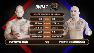 W kolejnej walce Patryk Bąk (1-5-0) skrzyżuje rękawice z Piotrem Dembińskim (1-5-0) w walce na zasadach kickboxingu (limit - 75 kg).