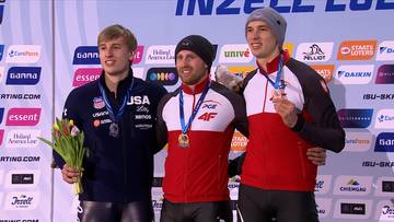 Ceremonia medalowa z udziałem Marka Kani i Damiana Żurka po rywalizacji na 500 m w Inzell