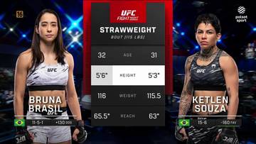 115 lb: Ketlen Souza (16-6) pokonała Brunę Brasil (11-6-1) jednogłośną decyzją sędziów (29-28, 29-28, 29-28).