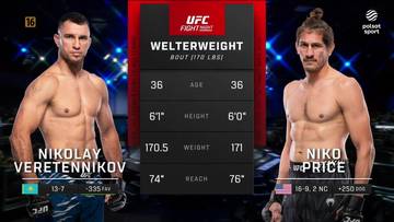 170 lb: Nikolay Veretennikov (14-7) pokonał Niko Price'a (16-10, 2NC) przez techniczny nokaut (ciosy w stójce) w pierwszej rundzie.