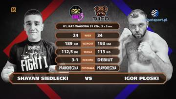 90 kg: Shayan Siedlecki (4-1-0) pokonał Igora Płoskiego (0-1-0) większościową decyzją sędziów (29-27, 28-28, 29-27) - K1.