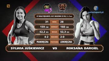 52 kg: Sylwia Juśkiewicz (5-2) pokonała Roksanę Dargiel (2-1) jednogłośną decyzją sędziów (30-27, 30-27, 30-27) - K1 w małych rękawicach.