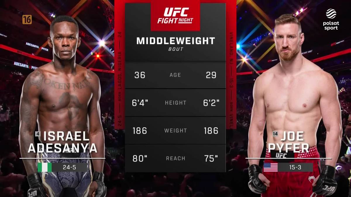 Były mistrz kategorii średniej z pięciu poprzednich starć wygrał zaledwie jedno (z Alexem Pereirą na gali UFC 287 w kwietniu 2023 roku). Do konfrontacji z Pyferem przystępował jako czwarty zawodnik rankingu swojej dywizji. Amerykanin mógł z kolei pochwalić się imponującą serią czterech triumfów z rzędu, co dawało mu 14. lokatę w zestawieniu wagi średniej UFC.