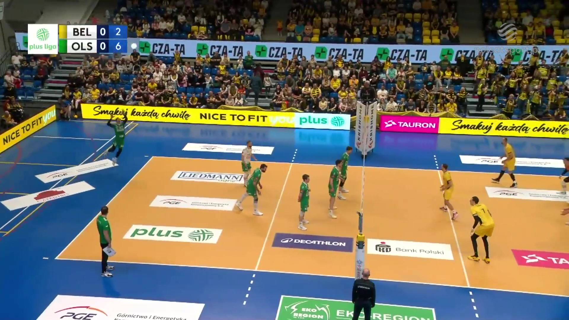 W trzecim secie, po wyrównanym początku (7:7), trzy akcje z rzędu wygrali olsztynianie (7:10). W odpowiedzi gospodarze popisali się niecodzienną serią... dziewięciu wygranych akcji (16:10), gdy zagrywał Grzegorz Łomacz. Goście dostali zadyszki, co wykorzystali bełchatowianie, którzy nie oddali już prowadzenia w tej partii. Antoine Pothron wywalczył piłkę setową, a po chwili Bartłomiej Lemański zaskoczył rywali zagrywką i ustalił wynik na 25:18.